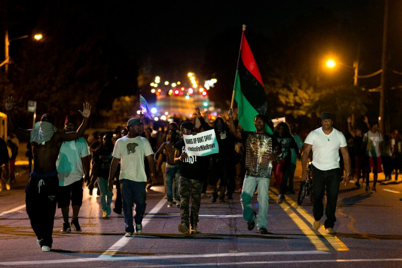 Demonstrators march in the street while protesting the shooting death of black teenager Michael Brown in Ferguson, Missouri August 12, 2014. Police said Brown, 18, was shot in a struggle with a gun in a police car but have not said why Brown was in the car. At least one shot was fired during the struggle and then the officer fired more shots before leaving the car, police said. But a witness to the shooting interviewed on local media has said that Brown had been putting his hands up to surrender when he was killed. The FBI has opened a civil rights investigation into the racially charged case and St. Louis County also is investigating. REUTERS/Mario Anzuoni (UNITED STATES – Tags: CRIME LAW)