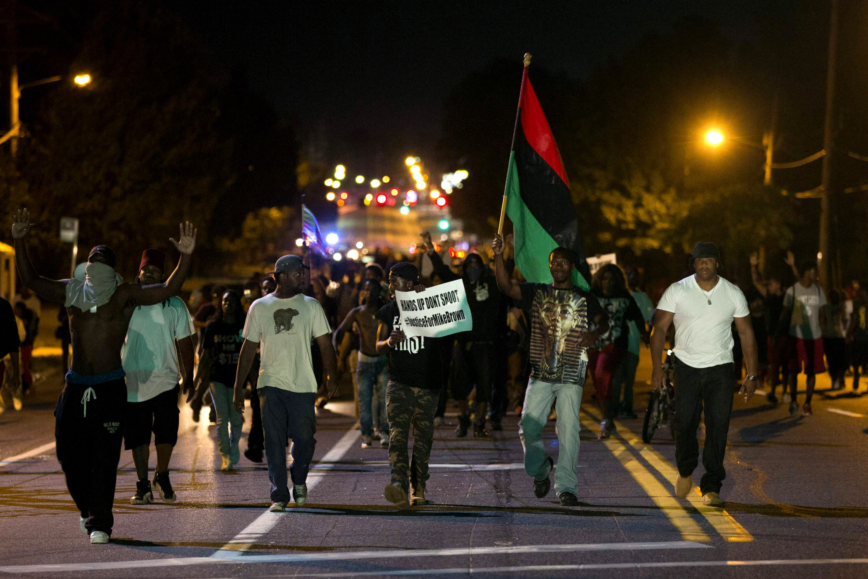 Demonstrators march in the street while protesting the shooting death of black teenager Michael Brown in Ferguson, Missouri August 12, 2014. Police said Brown, 18, was shot in a struggle with a gun in a police car but have not said why Brown was in the car. At least one shot was fired during the struggle and then the officer fired more shots before leaving the car, police said. But a witness to the shooting interviewed on local media has said that Brown had been putting his hands up to surrender when he was killed. The FBI has opened a civil rights investigation into the racially charged case and St. Louis County also is investigating. REUTERS/Mario Anzuoni (UNITED STATES – Tags: CRIME LAW)