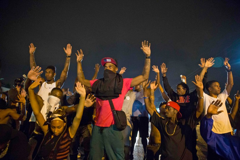 Demonstrators confront police with their arms raised during on-going demonstrations to protest against the shooting of Michael Brown, in Ferguson, Missouri, August 16, 2014. Protesters in Ferguson said late on Friday on Twitter that police had fired tear gas at a crowd protesting over the police shooting death of Brown, an unarmed black teen. The reported outbreak late Friday evening came after almost a week of nighttime clashes between local police and protesters saw a 24-hour break as those police forces were replaced by state police led by an African-American captain. REUTERS/Lucas Jackson (UNITED STATES – Tags: CIVIL UNREST CRIME LAW)